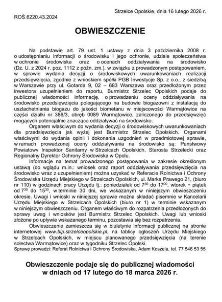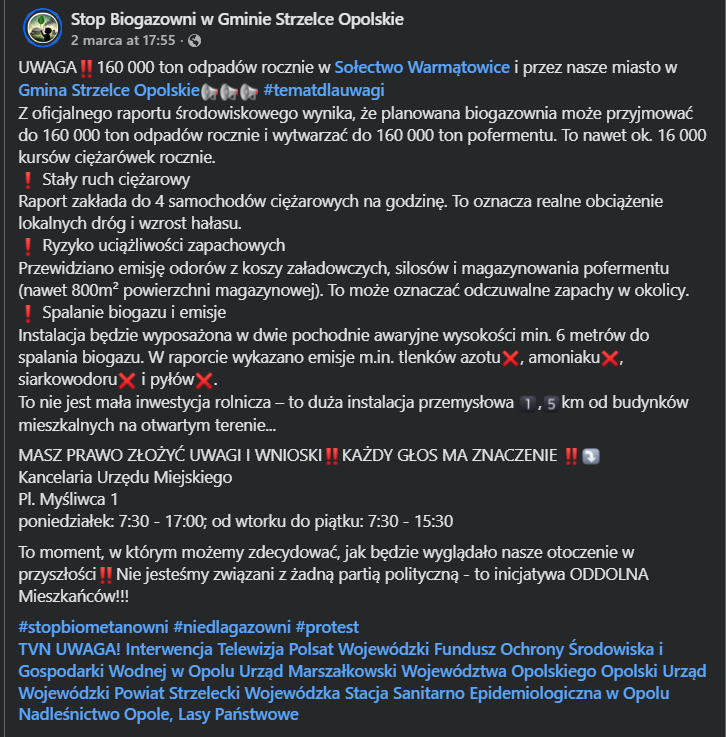„Szanowni Państwo, rozumiemy, że informacje dotyczące planowanej budowy biogazowni budzą emocje i rodzą wiele pytań. Obecnie trwa procedura administracyjna, w ramach której mogą Państwo wyrazić swoje opinie, wątpliwości i uwagi.”