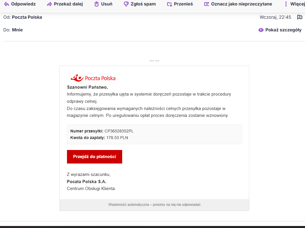 Tym razem scenariusz jest prosty i aż nazbyt wiarygodny. Poczta Polska informuje o rzekomej odprawie celnej, podaje numer przesyłki, konkretną kwotę do zapłaty i zapewnia, że po uregulowaniu należności proces doręczenia zostanie wznowiony. Wszystko wygląda „urzędowo”, grzecznie i rzeczowo. Problem w tym, że to nie Poczta Polska – tylko oszuści.