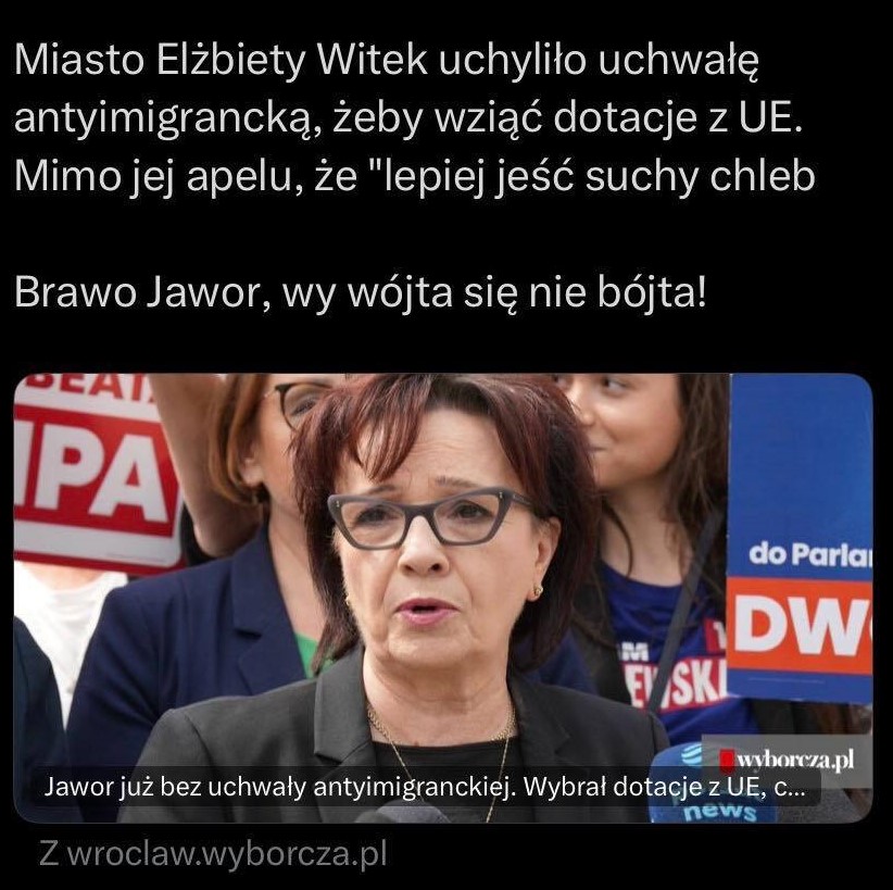 Jawor w ostatniej chwili wyciągnął głowę z pętli. Radni zrozumieli, że bezpieczeństwo buduje się sprawną infrastrukturą i silną gospodarką, a nie papierowymi deklaracjami, które budzą jedynie śmiech w Brukseli i politowanie u sąsiadów. Szkoda tylko, że Elżbieta Witek nie zaproponowała, że z własnej diety poselskiej sfinansuje te 162 miliony. Wtedy jej apel o suchym chlebie brzmiałby chociaż odrobinę wiarygodniej.