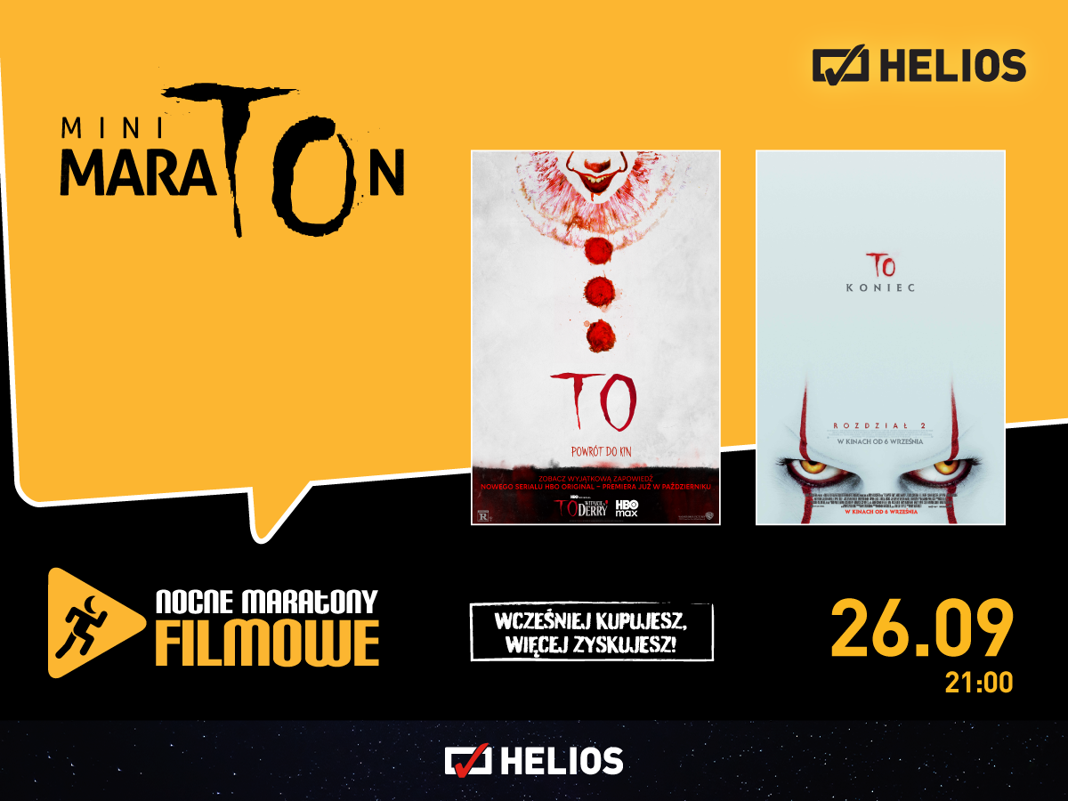 Fani mocnego kina mogą wybrać się na Mini Maraton „To”, który zawita do wszystkich lokalizacji sieci Helios w piątek, 26 września. W ramach nocnych pokazów zostaną wyświetlone dwie części serii na podstawie popularnej powieści Stephena Kinga. Natomiast na melomanów i wielbicieli talentu słynnego tenora czekają pokazy dokumentu „Andrea Bocelli: Because I Believe”, które odbędą się w niedzielę, 28 września. W filmie zostanie ukazana historia życia artysty, jak też wywiady i archiwalne materiały z niesamowitych występów.