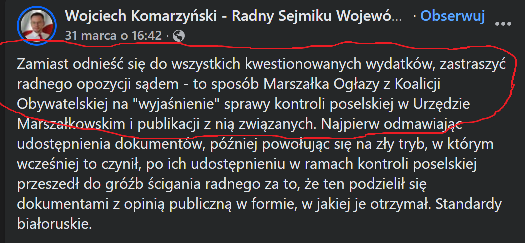 Szanowny Panie Radny! Trzeba Panu przyznać jedno – ma Pan tupet. Stać ramię w ramię z Marszałkiem, słuchać pełnych wyjaśnień przez kilkanaście minut, a potem opublikować w sieci tylko te dziesięć sekund, w których Marszałek wspomina o drodze prawnej? To już nie jest „kontrola społeczna”, to jest polityczny Photoshop w wersji hardcore.