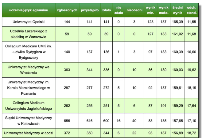 W klasyfikacji ogólnej, obejmującej wszystkich zdających, Wydział Lekarski UO zajął wysokie, trzecie miejsce.