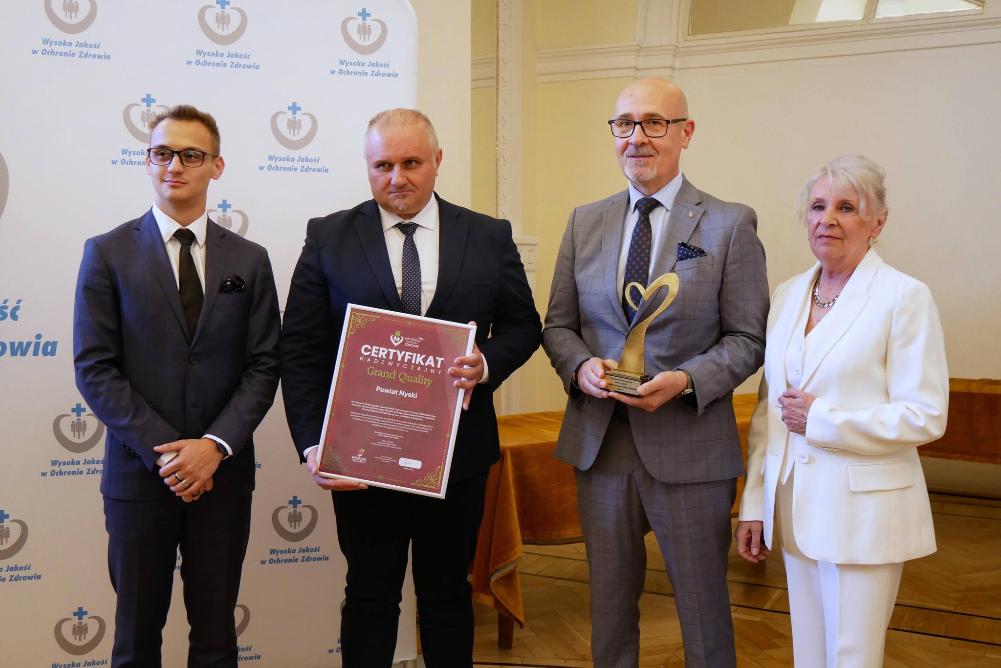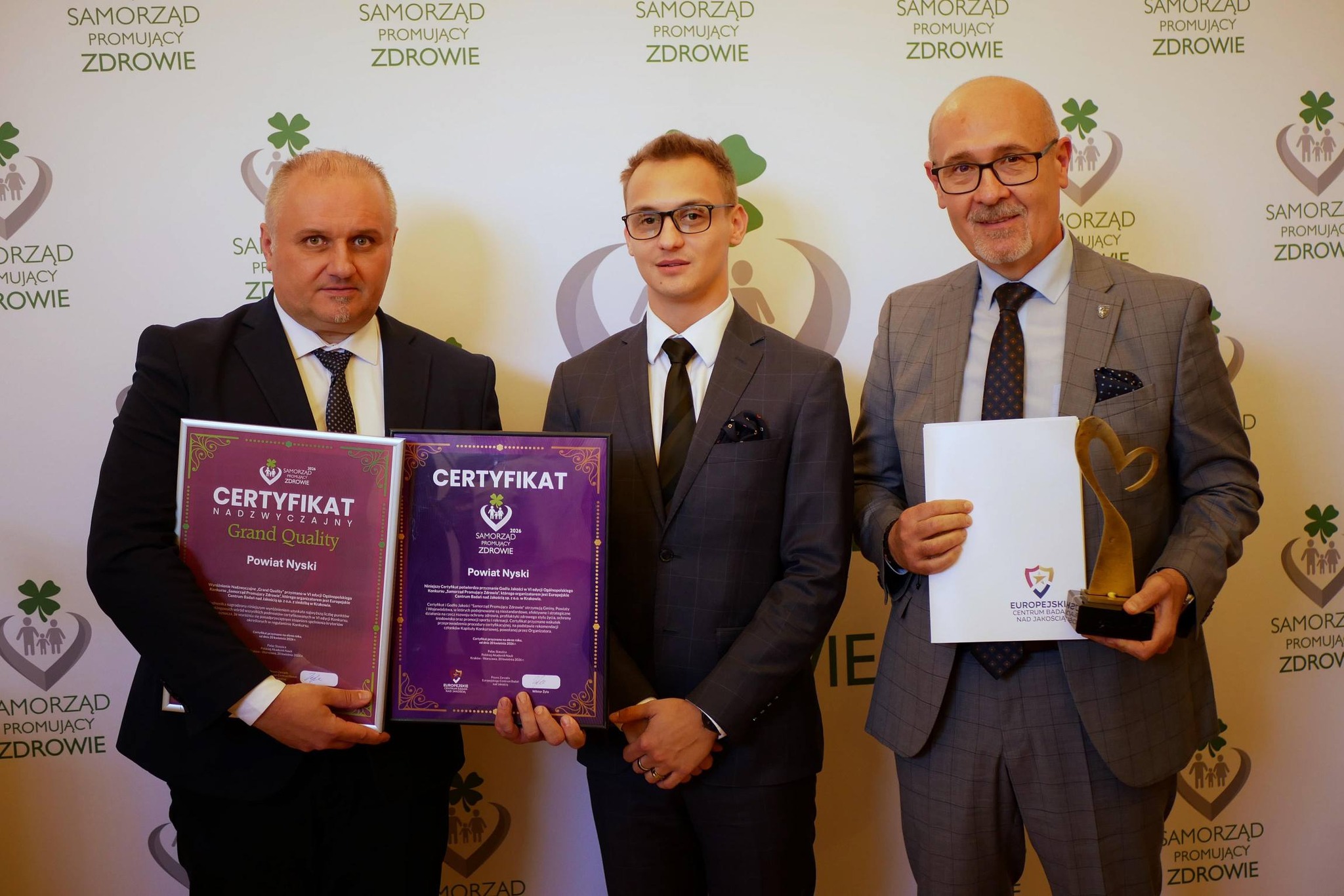Dzisiaj razem z przewodniczącym Komisji Zdrowia i Spraw Społecznych Ireneuszem  Szafrańcem byliśmy odebrać Certyfikat Godła Jakości w konkursie Samorząd Promującym Zdrowie organizowanym przez Europejskie Centrum Badań nad Jakością. Okazało się że wśród certyfikowanych samorządów dostaliśmy największą liczbę punktów i dostaliśmy Certyfikat Nadzwyczajny. To drodzy Państwo efekty wspólnej pracy na rzecz ochrony zdrowia całego samorządu Powiatu Nyskiego i pracowników starostwa za którą dziękuję. Szczególne uznanie znalazły nasze działania z uruchomieniem stypendiów dla lekarzy, zakup nowoczesnych ambulansów, zwiększenie potencjału Zespoły Ratownictwa Medycznego – Nysa , akcje profilaktyczne ale też duże znaczenie miały nasze plany budowy nowego szpitala i przygotowania do konsolidacji. Bardzo cieszy że wyznaczona przez nas droga do polepszenia systemu ochrony zdrowia w powiecie znalazła uznanie – informuje Daniel Palimąka.