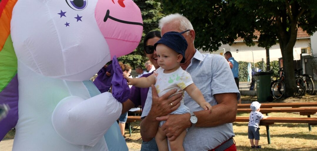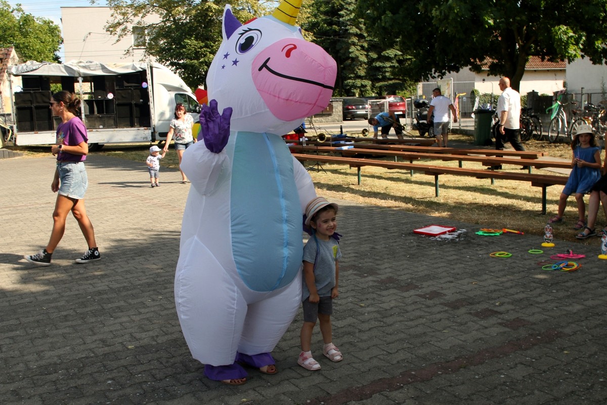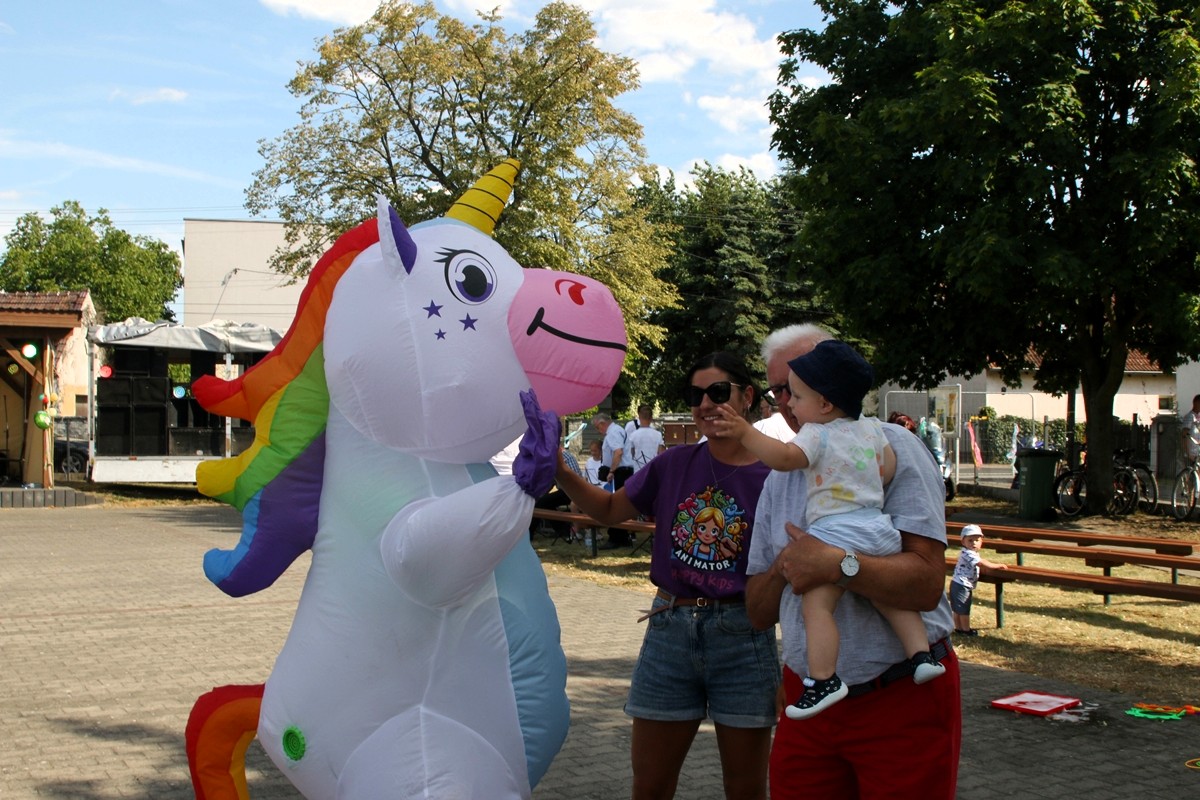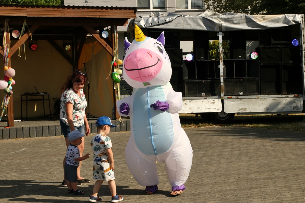 Na placu obok świetlicy wiejskiej dzieci mogły zrobić sobie brokatowy tatuaż czy zatańczyć z jednorożcem.